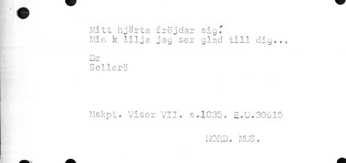 //// Mitt hjärta fröjdar sig T //// Min k lilja jag ser glad till dig.., //// ¦fep -6' : //// ! Dr //// Sollerö //// Mskpt. Visor VII. s.1035* E.U,30615 //// NORD. MUS * ////