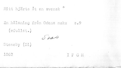 //// o + //// Mitt hjärta at en svensk En hälsning från Odens maka s«9 //// (of ullst•) //// c //// Steneby (Dl) //// 1062 I F G H ////