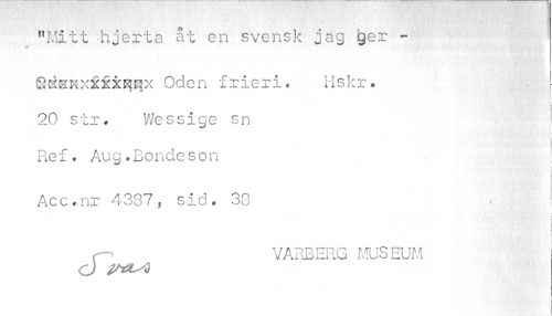 //// "Mitt h jer t a åt en svensk jag ger -SöatRxfixq^x Oden frieri, Hskr. //// i //// 20 str. Wessige sn //// i //// Ref. Aug.Bondeson //// * //// : i //// J //// Acc.nr 4337, sid, 33 //// C- VARBERG MUSEUM //// O VtZ^ //// I ////
