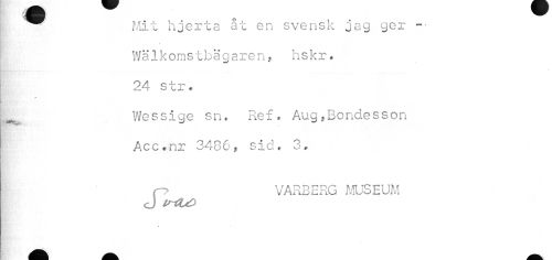 //// ^^ Mit hjerta åt en svensk jag ger -- //// Wälkomstbagaren, hskr. 24 str. //// ^ Wessige sn. Ref, Aug,Bondesson //// Acc.nr 3486, sid. 3. //// C? VARBERG MUSEUM //// J irOU) ////