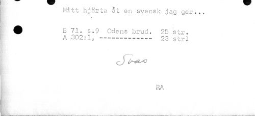//// Mitt hjärta åt en svensk jag ger.., //// ^ B 71. s.9 Odens brud. 25 str. j A 302:1, --- 23 str I //// o) is-étsQ //// RA //// Hk......,,...,....._ ////