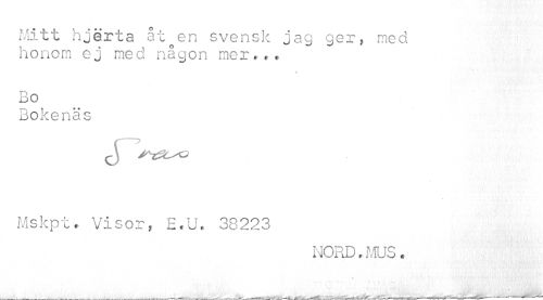 //// Mitt hjärta åt^en svensk jag ger, med honom ej med någon mer»»* //// Bo //// Bokenäs //// Mskpt. Visor, E.U. 38223 //// NORD.MUS. //// •7 ^ .V, Mk f 'V • • ( 'Y(r V •1 //// 1 ' ' ////