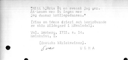 //// ' i //// "Mitt hjärta åt en svensk jag ger, I At^honom men åt ingen mer //// jag dansar bröllopsdansen." //// i (Visa om Odens frieri och bortrövande //// av skön Hildegard i Hässledal). //// » //// Vml. Norberg, 1721. s. 14. ; Holmkvist, E. //// (Enstaka kärleksvisor). ! 0 U L M A ////