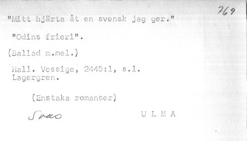 //// "Mitt hjärta åt en svensk jag ger." //// "Odins frieri".. //// (Ballad nu mel.) //// //// /Hall. Vessige,;. 2445:1, s. 1. Lagergren. //// (Enstaka romanser) i //// jWo U L m A //// //// /! i ////