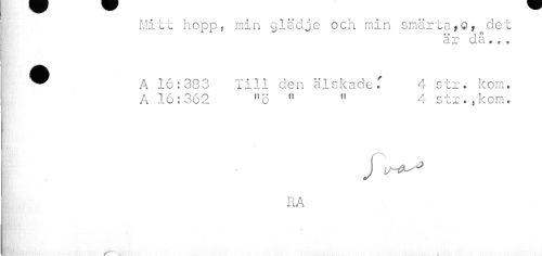 //// Mitt hopp, min glädje och min smärtade, det //// • » i o //// ar da .•. . //// ^ A 16:383 Till den älskade T 4 str. kom. //// A 16:362 »ö " 11 4 str., kom. //// J ^ //// RA ////