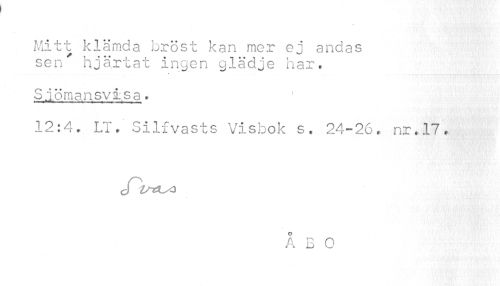 //// Mitt klämda bröst kan mer ej andas sen' hjärtat ingen glädje har. //// Sjömansvisa > //// 12:4, LT, Silfvästs Visbok s. 24-26, nr.17. //// ÅBO ////