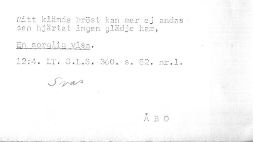 //// Mitt klämda bröst kan mer ej andas sen hjärtat ingen glädje har, //// En sorglig visa* //// 12:4. LT. S.L.S. 360. s. 82. nr.l. //// sShs-*/* //// i //// ÅBO ////