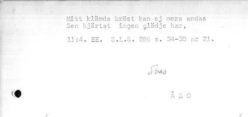 //// ¦v « //// < % *v " " " • //// I //// Mitt klämda bröst kan ej mera andas Sen hjärtat ingen glädje har, //// 11:4. EE. S.L.S. 286 s. 34-35 nr 21. //// i //// J) 1M4 //// f C ////