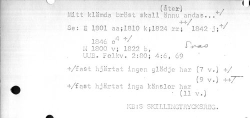 //// låter) //// Mitt klämda bröst skall ännu andas*,. ' //// Se: E 1801 aa;1810 k;1824 rr; 1842 i;'7 //// 1846 o4 +// p //// N 1800 v; 1822 b, J //// UUB. Folkv. 2:80; 4:6, 69 //// +/fast hjärtat ingen glädje har (7 v.) + //// /: (9 v.) //// ^^ +/fast hjärtat inga känslor har //// KB :S SKILLINGTRYCKSREG. ////