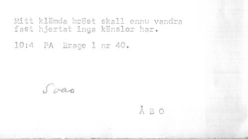 //// Mitt klämda bröst skall ennu vandra fast hjertat inga känslor har. //// 10:4 . PA Brage 1 nr 40. //// ÅBO ////