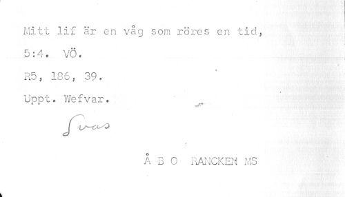 //// Mitt lif är en våg som röres en tid, //// ! i //// 5:4. VÖ. //// ¦ //// SS* a //// R5, 186, 39. //// Uppt. Wefvar* ' ^ //// i //// Å B O RANCKEN MS //// k ////