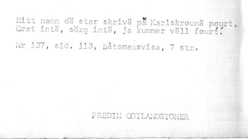//// Mitt namn dä står skriva pa Karlskrounä pourt, Gr a t inta, sörg intä, ja kummer väll fourl.' //// Nr 137, sid. 113, Båtsmansvisa, 7 str. //// FREDIN GOTLANDSTONER //// > "'-V.'' ' //// « - , , "> • ' '» t » " ' //// \ v - //// ? //// ___ , . W. ---- ._ ------— . ____—. .. .......----.--— ¦ -----•-------I «' I ---—-1--i—* ////
