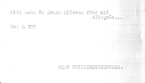 //// Mitt namn är Johan Nilsson född uti //// Alingsås,.. //// Se: G 238 //// • * KB:S SKILLINGTRYCKSREG. //// k ////