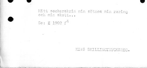 //// i f //// Mitt sockerskrin min sötnos min raring och min skatt... //// ^ Se: E 1902 f4 //// KB:S SKILLINGTRYCKSREG. ////
