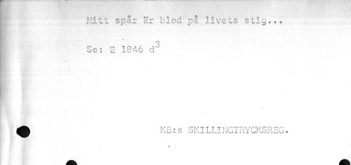 //// mm, //// 0 q //// I Mitt spar är blod pa livets stig... //// fr SvÄ®?' //// I //// Se: E 1846 d3 //// •KB:s SKILLINGTRYCKSREG. ////