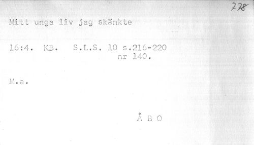 //// yU y /^i //// / iT V i //// i //// . ... V i //// Mitt unga liv jag skänkte //// i //// ' • v • //// 16:4. KB. S.L.S. 10 s.216-220 //// nr 140. //// M. a. //// Å B O ////