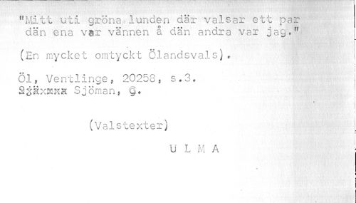 //// "Mitt uti gröna lunden där valsar ett par dän ena var vännen å dän andra var jag." //// , * .. //// (En mycket omtyckt Olandsvalsj * //// i Bli • fnu ¦ m * * ^ //// b //// Öl, Ventlinge, 20258, s.,3. Sääx^KH Sjöman, //// I « //// (Valstexter) //// f r* //// i i //// U L M A //// i //// i i //// i ////