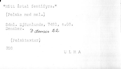 //// "Mitt årtal femtifyra*" //// i //// (Polska med mel.) . j //// i //// . i //// ! //// Sdrnl. Björnlunda7481, s.68. Dencker. c* . * + //// (Polsktexter) 358 //// U L M A //// » ////