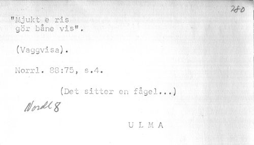 //// /<ro //// "Mjukt e ris //// gör båne vis". ! //// (Vaggvisa). //// Norrl. 88:75, s.4. //// //// /(Det sitter en fågel..») //// U L M A ////