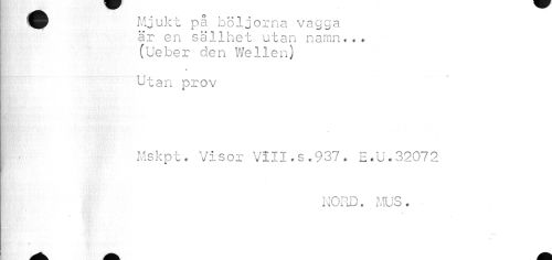 //// Mjukt på böljorna vagga är en sällhet utan namn... //// (Ueber den Wellen) //// » //// F Utan prov //// Mskpt. Visor VIII.s.937. E.U.32072 //// NORD. MUS. //// ¦»• //// //// /