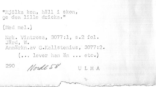 //// "Mjölka kon, häll i skon, ge den lille dricka." //// r //// (Med. mel.) //// Nrk. Vintrosa„ 3077:1, s.2 fol. Järd, W* //// Anmärkn.av G.Kallstenius,3077:2.. (« . « lever han än .. . etc-.) //// 29o //^r^ u L M A ////