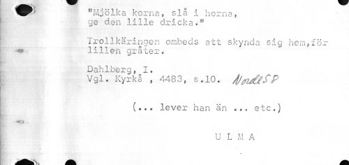 //// "Mjölka korna, slå i hörna, - ge den lille dricka." //// Trollkäringen ombeds att skynda sig hem,för lillen gråter. //// Dahlberg, I. //// Vgl. Kyrkå , 4483, s.10. J/fflde^P //// (••• lever han än etc.) //// »• * i ¦>*$*. //// U L M A //// HB ' Hnntuffiy ' //// * ////