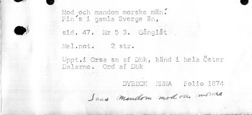 //// Mod och mandom morske män' Fin/s i gamla Sverge än,, //// Wp' sid, 47. Nr 5 3. Gånglåt //// * //// Mel.not. 2 str» //// Uppt.i Orsa sn af Dbk, känd i hela öster Dalarne. Ord af Dbk //// DYBECK RUNA Folio 1874 //// jc^o chu^ru, c»***** //// mhIB^^BB^BBBBBk^^ .... — ;____ — . ^____ ___j_... _ ..... ... ... ^ „. .. k ////