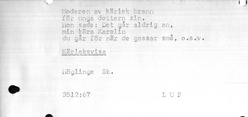//// ----.-*v //// Moderen av kärlek brann för unga dottern sin» Hon sade: Det går aldrig an, min kära Karolin //// du går för när de gossar små,. o.s.v* Kärleksvisa //// Höglinge Sk. //// m fe //// ^ 3512:67 L U F ////