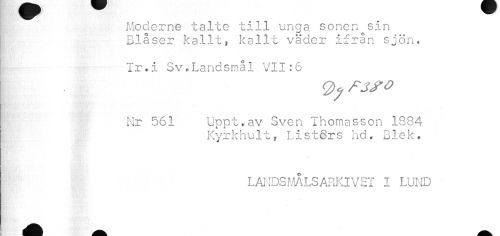 //// Moclerne talte till unga sonen sin Blåser kallt, kallt väder ifrån sjön. //// Tr.i Sv,Landsmål VII:6 //// Nr 561 Uppt.av Sven ihomasson 1884 //// Kyrkhult, ListSrs hd* Blek. //// « //// LANDSMÅLSARKIVET I LUND ////