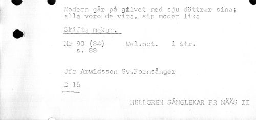 //// Modern går på gmlvet med sju döttrar sina; alla voro de vita, sin moder lika //// •i Skifta makar» //// Nr 90 (84) Mel.not. 1 str. s. 88 //// Jfr Arwidsson Sv.Fornsånger D 15 //// 1 //// KELLGREN SANGLEKAR FR NÄÄS II ////