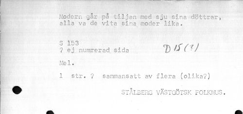 //// | Modern gar på tiljan med. sju sina döttrar * //// alla va de vita sina moder lika. //// 5 1^3 //// ? ej numrerad sida 7) //// Me 1. //// 1 str, ? sammansatt av flera (olika?) W' STÅLBERG VÄSTGÖTSK FOLKMUS, //// A ^^ ////