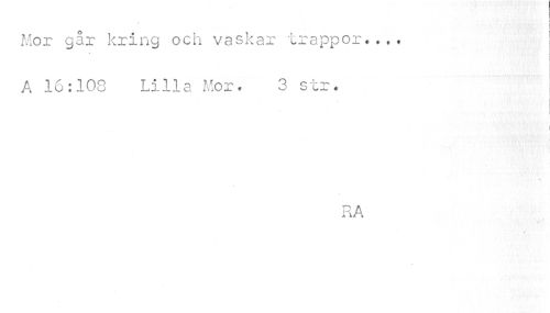 //// I //// i //// Mor går kring och vaskar trappor*. //// i //// A 16:108 Lilla Mor. 3 str. //// i //// ;1... i //// *|s>. ' : i i //// RA ////