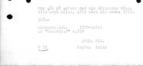 //// — //// « //// Mor går på golvet med sju döttrarna sina, alla voro hvita, alla voro sin-moder lika. //// mK K //// Skåne //// Hammarst.ark. 1880-talet //// Ur "Manuskr.9" s.,159 //// NORD. MUS. D 15 Kopior Lekar //// m i- < . //// 1 • ////