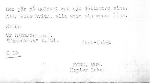 //// Mor går på golfvet med sju döttrarna sina, Alla voro hvita, alla voro sin moder lika. //// Skåne //// Ur Hammarst.ark. //// "Ma nu skr .9" s.151. opn . + //// looU"uale o //// D 15 //// t //// NORD. MUS. Kopior Lekar //// H r; ////