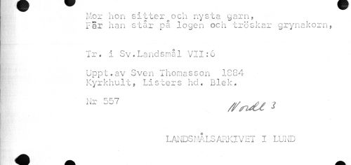 //// Mor hon sitter och nysta garn, //// Far han står på logen och tröskar grynakorn, //// Tr. i Sv.Landsmål VII:6 //// Uppt.av Sven Ihomasson 1S84 //// Kyrkhult, Listers hd. Blek. Nr * //// LANDSMÅLSARKIVET I LUND ////
