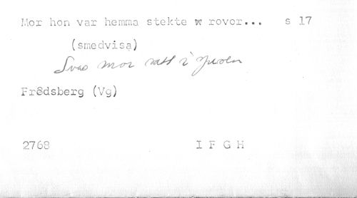 //// Mor hon var hemma stekte w rovor.«, s 17 //// (smedvisa) //// j^o cm^v ctejs 1 p-vcrtrt*^ //// Fr©dsberg (Vg) //// r\ *~~T f O T T^ ^ T T //// 27 08 IF G H //// ---—-----—---———-—......—-------— ———. ------- -—— ------ —__- ___ ////