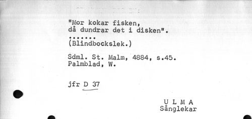 //// ;» *, * //// ...... « //// "Mor kokar fisken, då dundrar det i disken". //// (Blindbockslek.) //// Sdml. St. Malm, 4884, s.45. Palmblad, W. //// i //// jfr D 37 //// U LM A Sånglekar ////