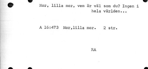 //// Mor, lilla mor, vem är väl som du? Ingen i //// hela världen.•• //// A 16:473 Mor,lilla mor. 2 str. //// RA //// < ////
