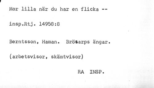 //// Mor lilla när du har en flicka — insp.Rtj. 14958:8 //// » //// Berntsson, Haman. Brösarps ängar. (arbetsvisor, skämtvisor) //// RA INSP. ////
