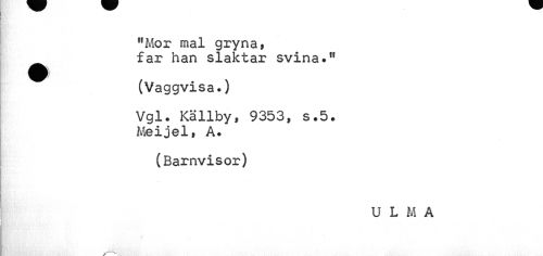 //// "Mor mal gryna, //// far han slaktar svina." //// M Wk //// m w) //// (Vaggvisa.) //// Vgl. Källby, 9353, s.5. Meijel, A. //// (Barnvisor) //// U L M A ////