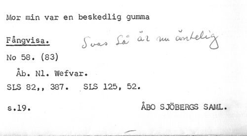 //// Mor min var en beskedlig gumma //// Fångvisa» y^ ^* ^ //// No 58. (83) //// Åb. Ni. Wefvar. //// SLS 82,, 387. SLS 125, 52. //// s.19. ÅBO SJÖBERGS SAML. ////