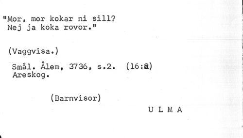 //// J //// "Mor, mor kokar ni sill? //// Nej ja koka rovor." j //// : i //// (Vaggvisa.) //// i //// 6 j //// Smål. Ålera, 3736, s.2. (16 Areskog. //// I //// i //// j //// i I //// (Barnvisor) //// U L M A //// • ^ \. • J //// i //// A ////