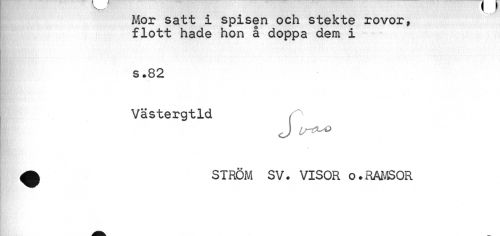 //// Mor satt i spisen och stekte rovor, flott hade hon å doppa dem i //// s .82 //// Västergtld //// J //// A STRÖM SV. VISOR o.RAMSOR ////