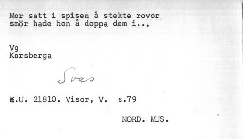 //// Mor satt i spisen å stekte rovor smör hade hon å doppa dem i..* //// - //// Vg //// Korsberga //// > //// <J v-cc^o //// .1 //// ; //// ! z i //// fi.U. 21810. Visor, V. s.79 //// NORD. MUS. //// ! ////
