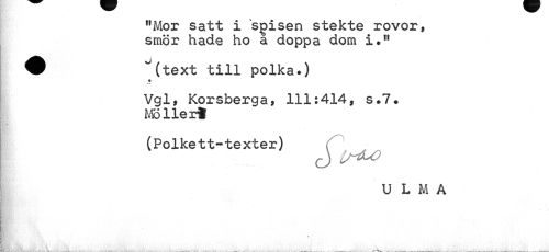 //// ftMor satt i sgisen stekte rovor, smör hade ho a doppa dom i.11 //// ^ "(text till polka.) //// Vgl, Korsberga, 111:414, s*7# Möller! //// (Polke tt-te xter) //// U L M A ////