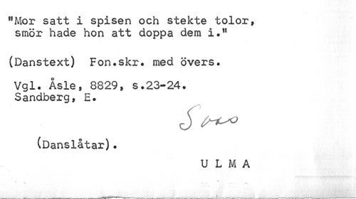 //// "Mor satt i spisen och stekte tolor, smör hade hon att doppa dem i." //// (Danstext) Fon.skr. med övers. //// Vgl. Åsle, 8829, s.23-24, Sandberg, E. //// £ //// (Danslåtar). //// U L M A //// ¦ ////