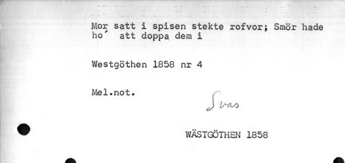 //// < //// • •• - //// Mor satt i spisen stekte rofvor; Smör hade ho' att doppa dem i //// - //// ¦ //// Westgöthen 1858 nr 4 //// ¦ //// Mel.not. //// J //// SÉiiÉ //// w WÄSTGÖTHEN 1858 ////