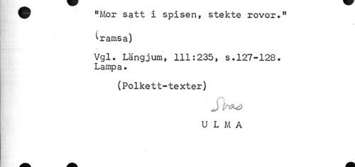 //// "Mor satt i spisen, stekte rovor." //// ^ramsa) //// Vgl* Längjum, 111:235, s.127-128. Lampa. //// (Polkett-texter) //// U L M A ////