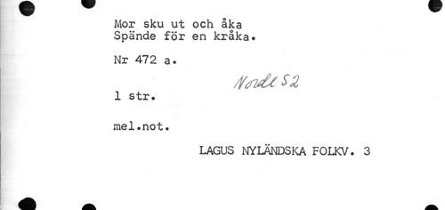 //// Mor sku ut och åka Spände för en kråka. //// Nr 472 a. //// /Ywäsz //// 1 StT. //// mel.not• //// LAGUS NYLÄNDSKA FOLKV. 3 ////