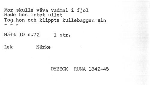 //// Mor skulle väva vadmal i fjol Hade hon intet ullet //// Tog hon och klippte kullebaggen sin //// Häft 10 s.72 1 str# Lek Närke //// s //// DYBECK RUNA 1842-45 ////